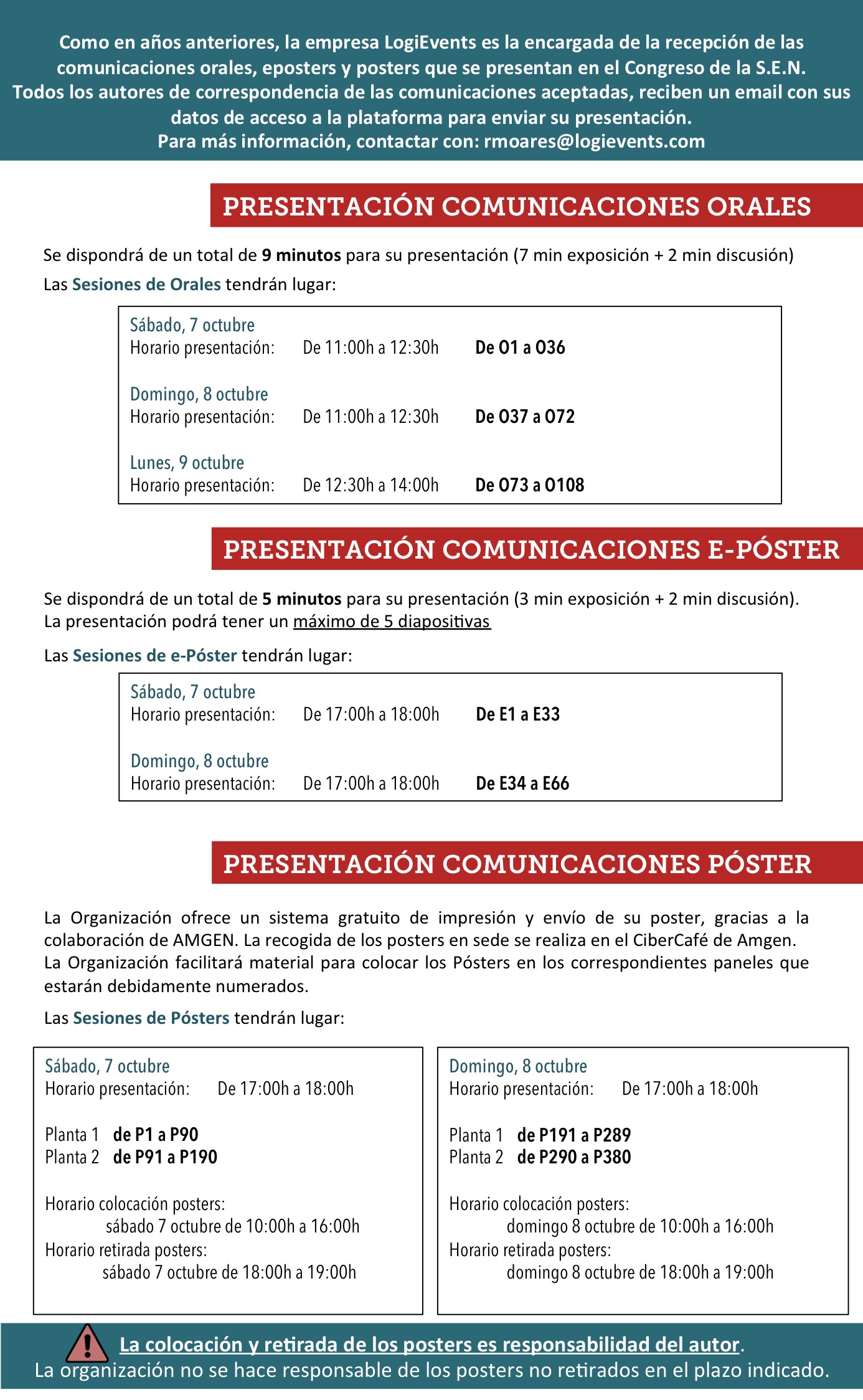 La no presentación de la comunicación en el Congreso, sin una causa justificada y notificada a la Secretaría de la S.E.N., tendrá como penalización la no aceptación de trabajos de dichos autores en el siguiente Congreso de la S.E.N.